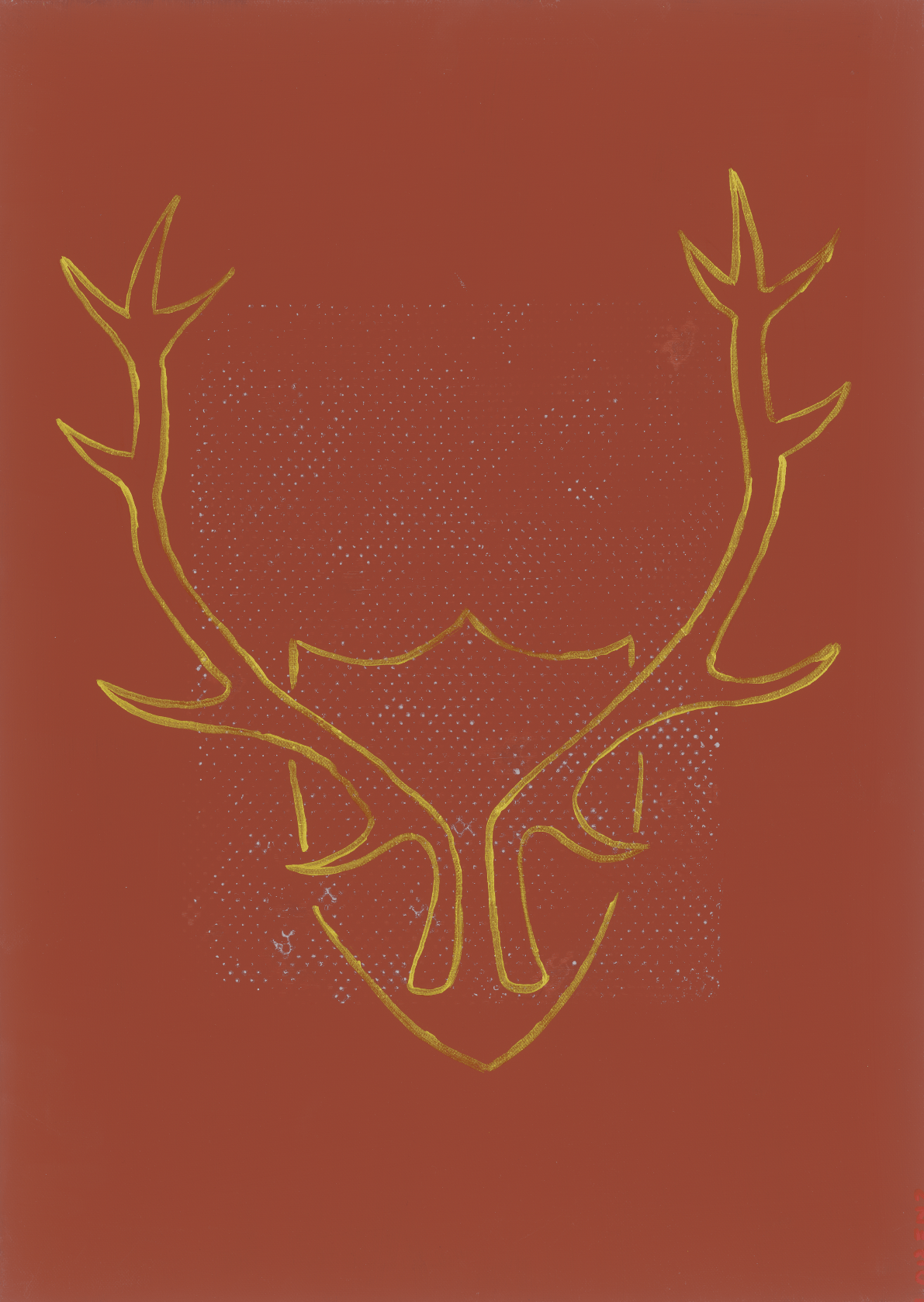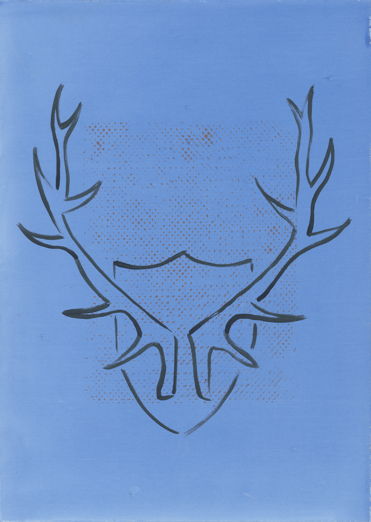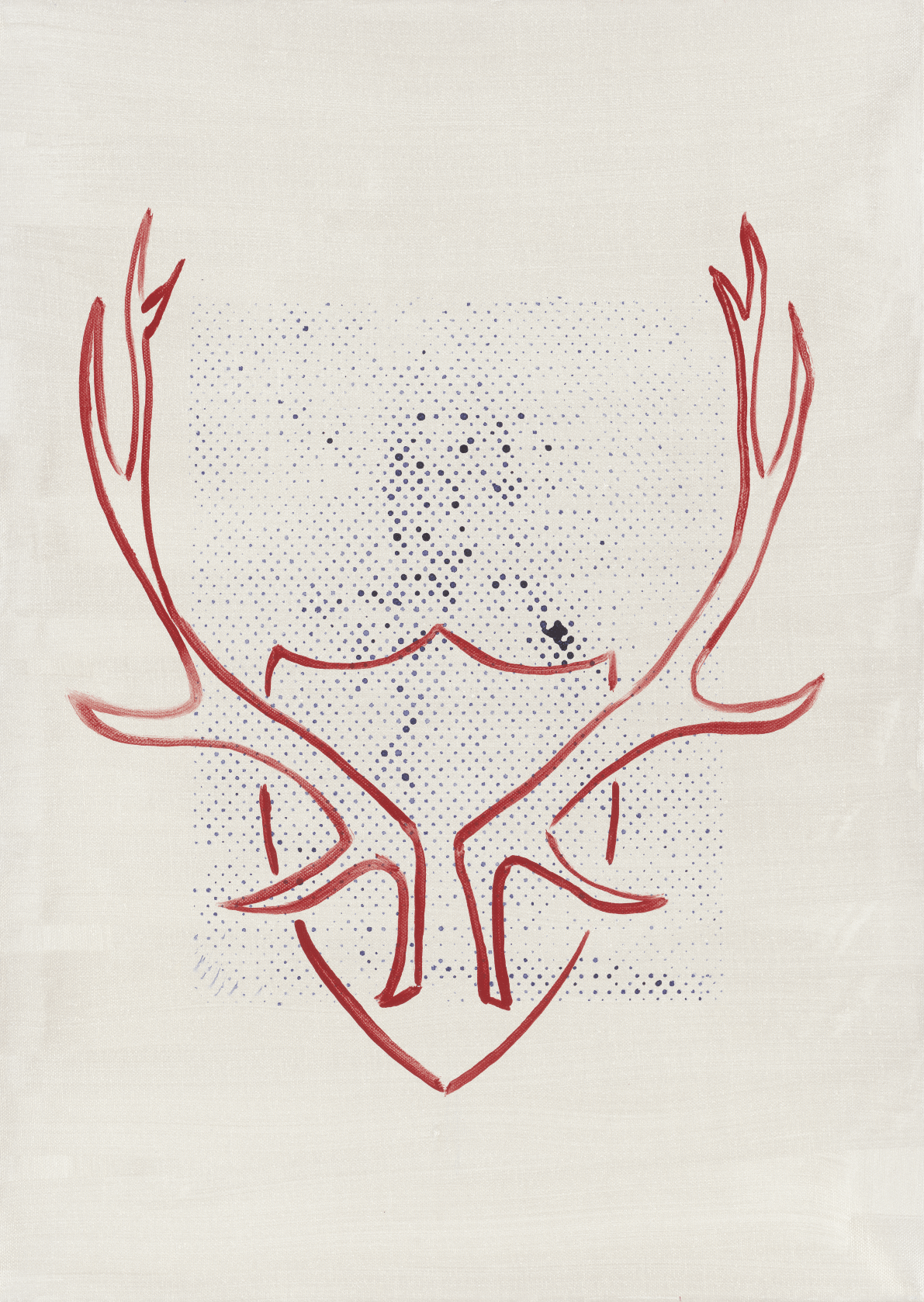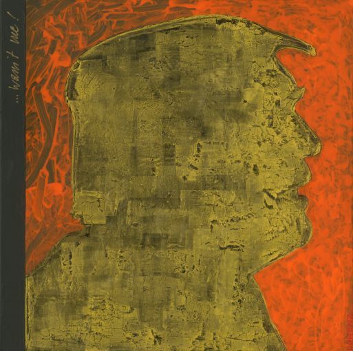 Das angedeutete Motiv mit dem Titel „Brain“ erinnert an einen Schädel, an einen Totenschädel genau genommen, dabei handelt es sich zuvörderst um eine rissige, rostrote Fläche. Die Mate-rialität ist präsent, die Farbe ist fast refliefartig aufgetragen und haptisch. Manchmal tauchen aber auch ganz eindeutig Gegenstände auf: zum Bei-spiel Maschinengewehre mit dem makaberen Werbeslogan, dass man beim Kauf von dreien eines geschenkt bekommt. Da steckt der ganze Zynismus der Rüstungsindustrie, aber auch der Politik drin.