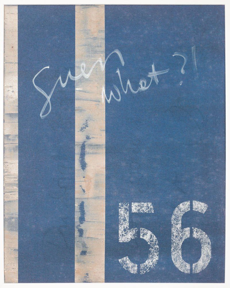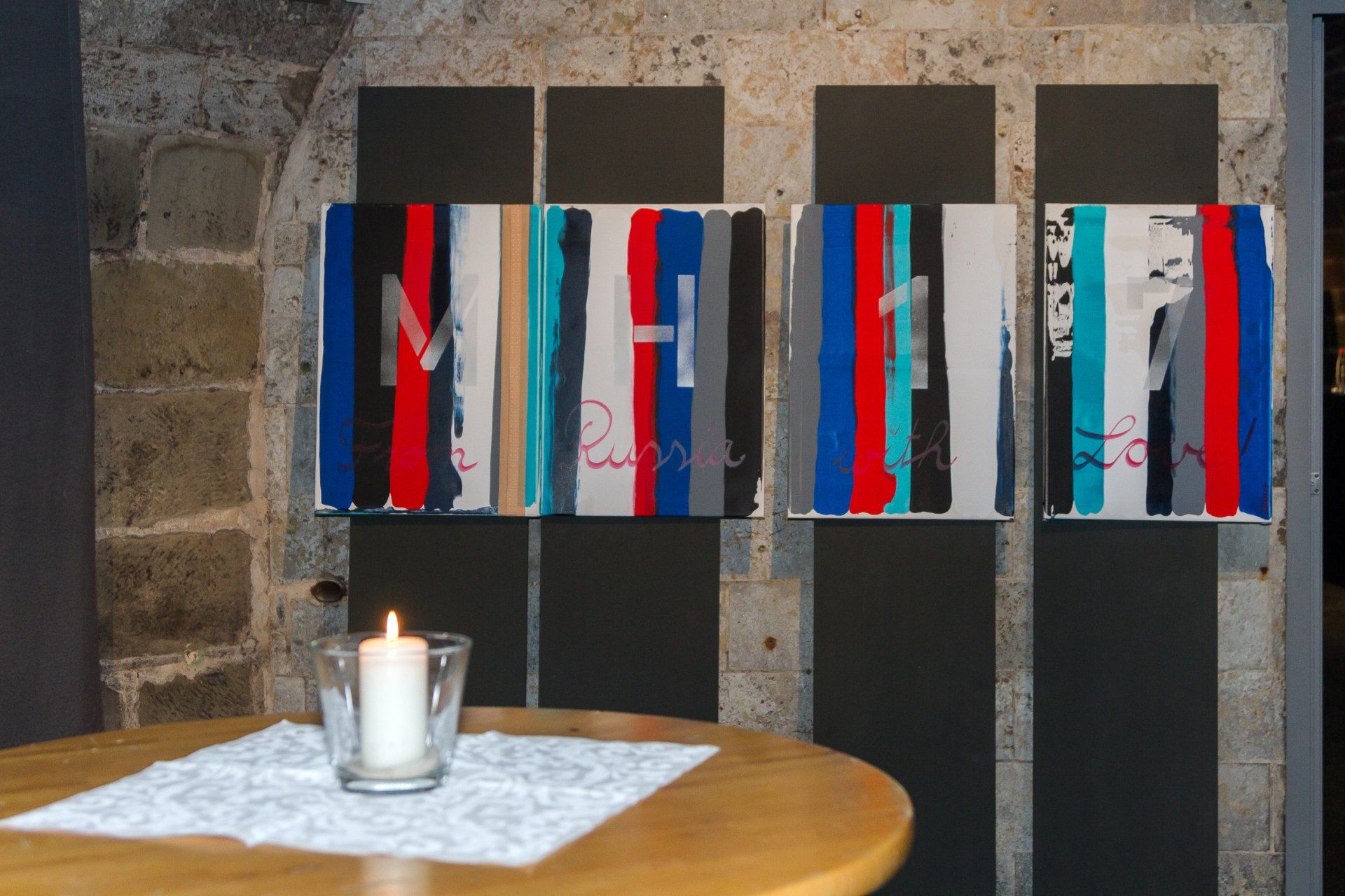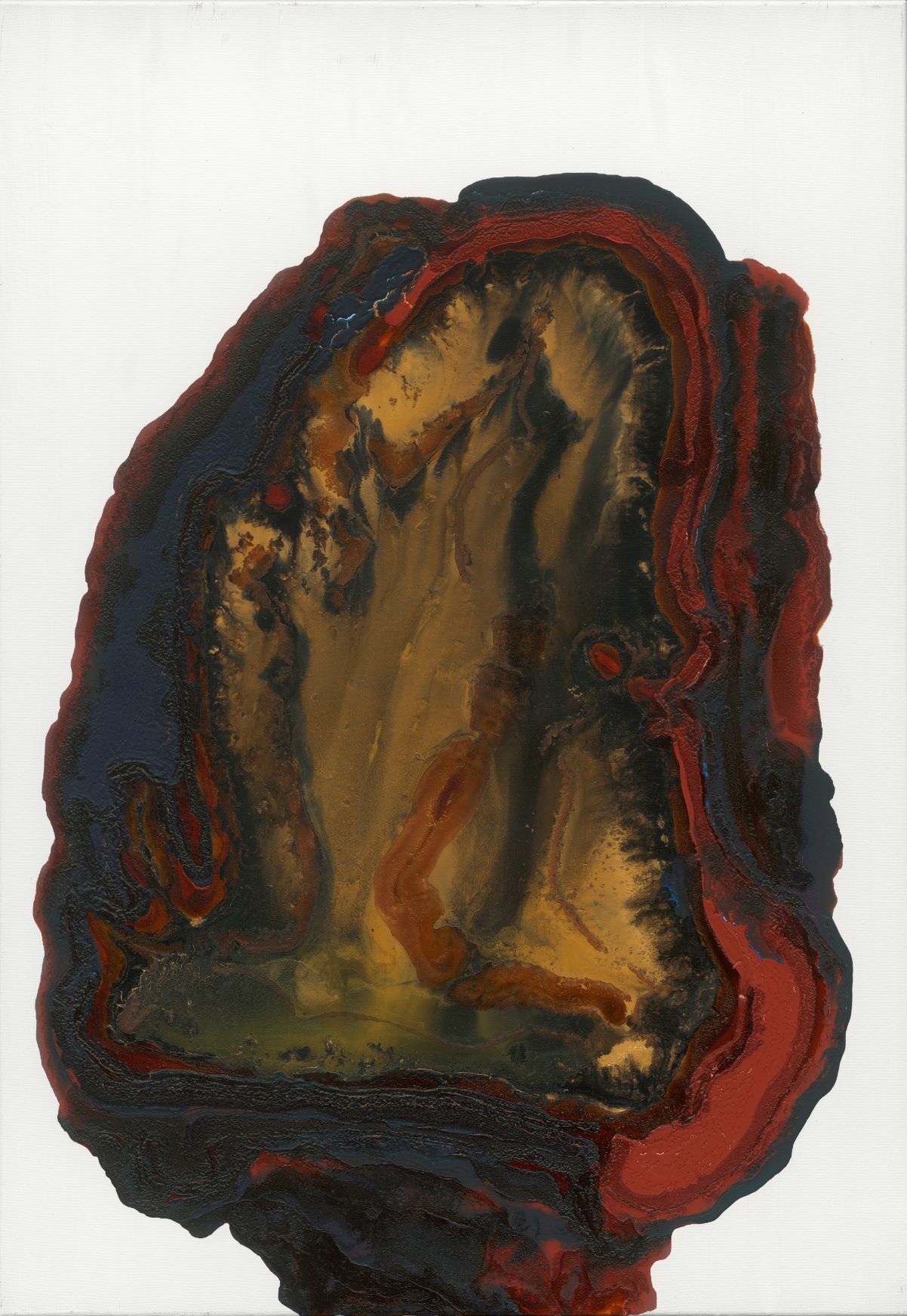Das angedeutete Motiv mit dem Titel „Brain“ erinnert an einen Schädel, an einen Totenschädel genau genommen, dabei handelt es sich zuvörderst um eine rissige, rostrote Fläche. Die Mate-rialität ist präsent, die Farbe ist fast refliefartig aufgetragen und haptisch. Manchmal tauchen aber auch ganz eindeutig Gegenstände auf: zum Bei-spiel Maschinengewehre mit dem makaberen Werbeslogan, dass man beim Kauf von dreien eines geschenkt bekommt. Da steckt der ganze Zynismus der Rüstungsindustrie, aber auch der Politik drin.