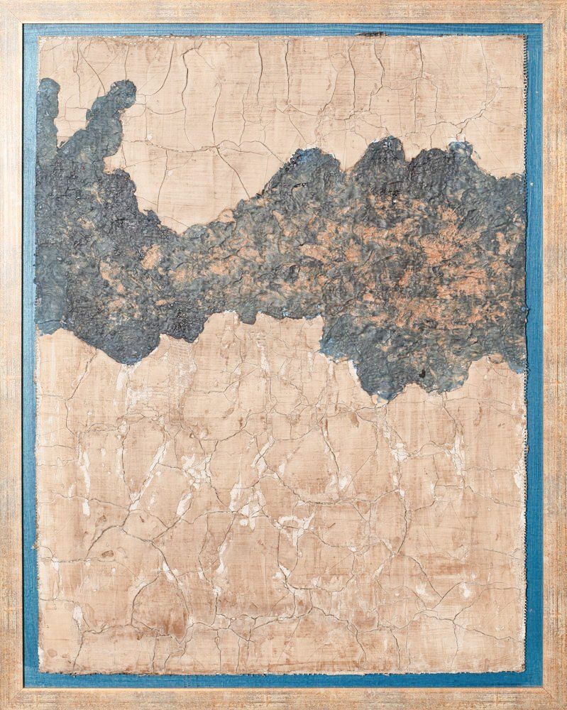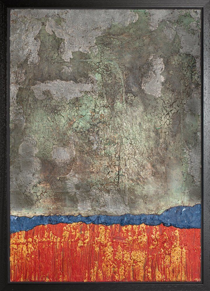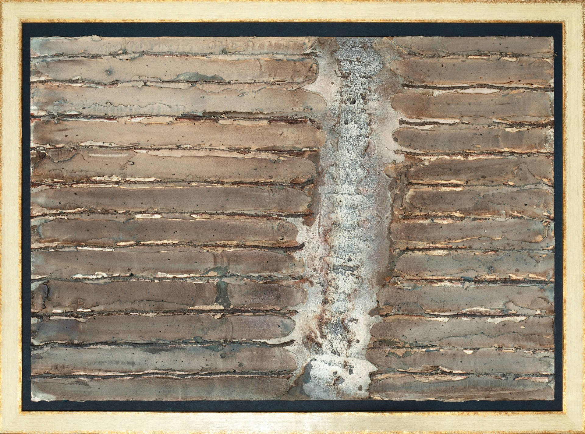 Wenn er unter dem Titel „Das Gleichgewicht“ Querstreifen auf die Fläche legt, die durch eine vertikale Linie durchbrochen werden, so ist das einerseits eine sehr schlichte, fast grafische Komposition. Es kann aber durchaus auch gegenständlich gedeutet werden – als Rückgrat, als Holzdielen, als Felder aus der Vogelperspektive.