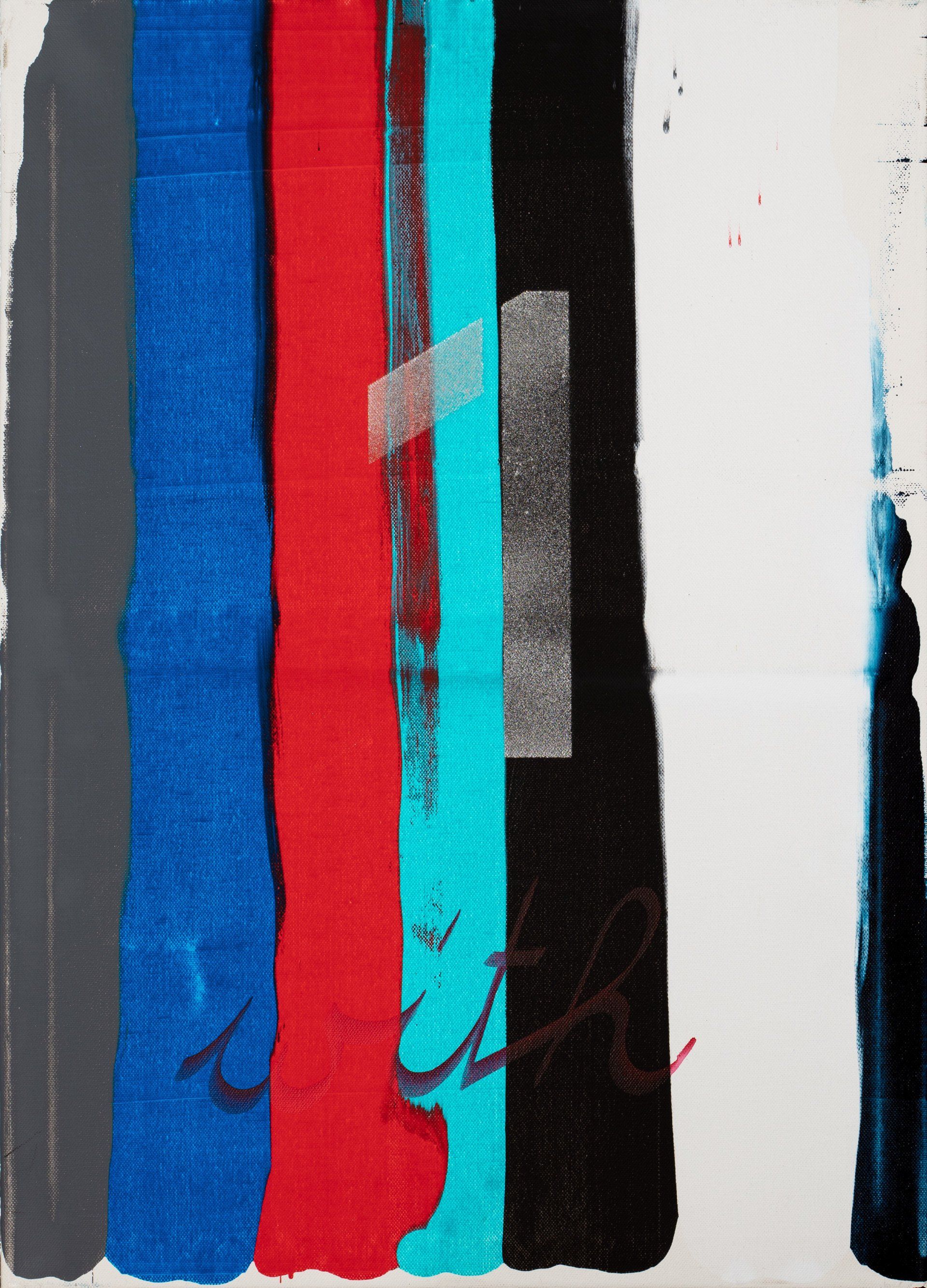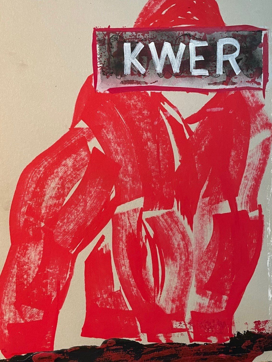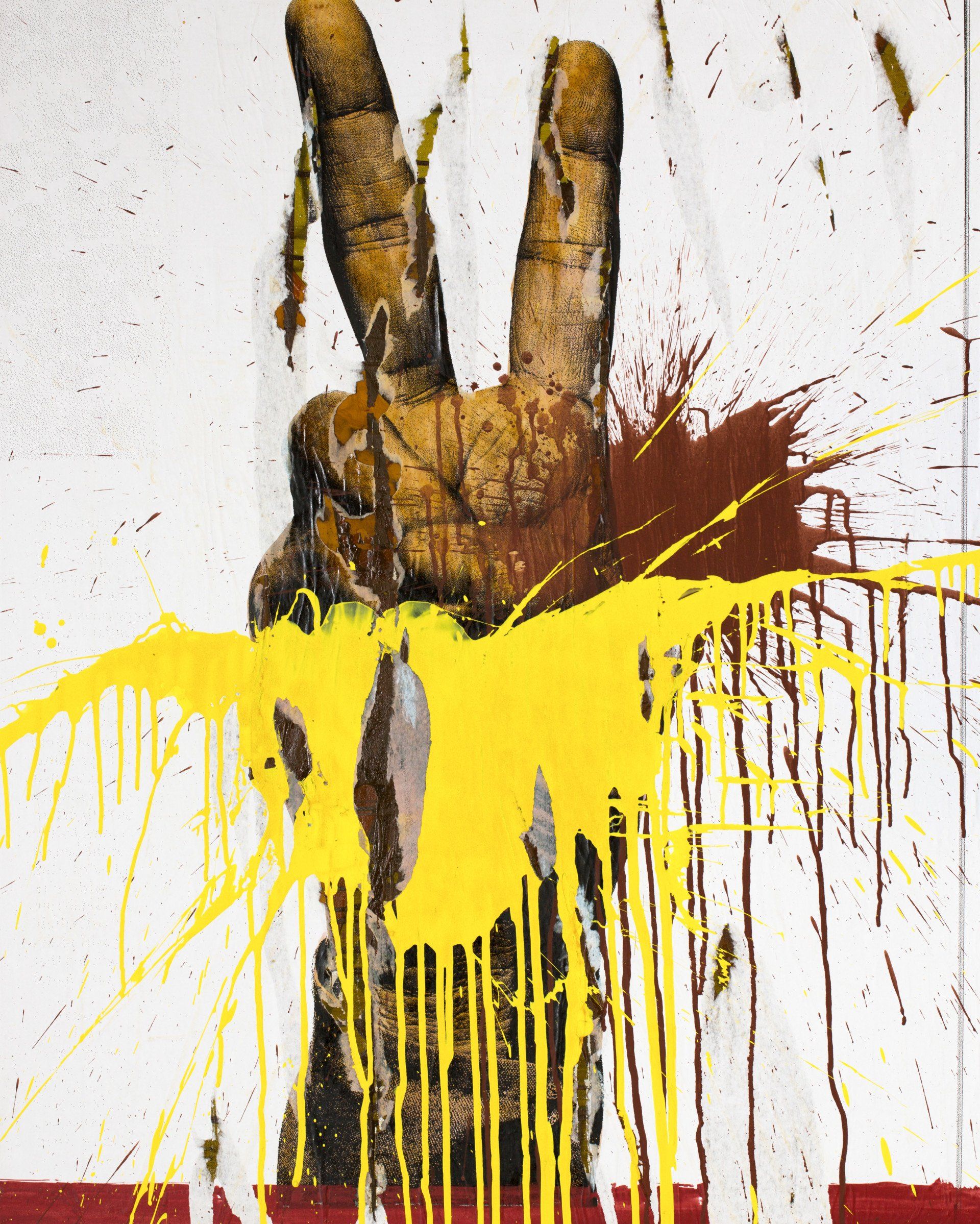 Das angedeutete Motiv mit dem Titel „Brain“ erinnert an einen Schädel, an einen Totenschädel genau genommen, dabei handelt es sich zuvörderst um eine rissige, rostrote Fläche. Die Mate-rialität ist präsent, die Farbe ist fast refliefartig aufgetragen und haptisch. Manchmal tauchen aber auch ganz eindeutig Gegenstände auf: zum Bei-spiel Maschinengewehre mit dem makaberen Werbeslogan, dass man beim Kauf von dreien eines geschenkt bekommt. Da steckt der ganze Zynismus der Rüstungsindustrie, aber auch der Politik drin.